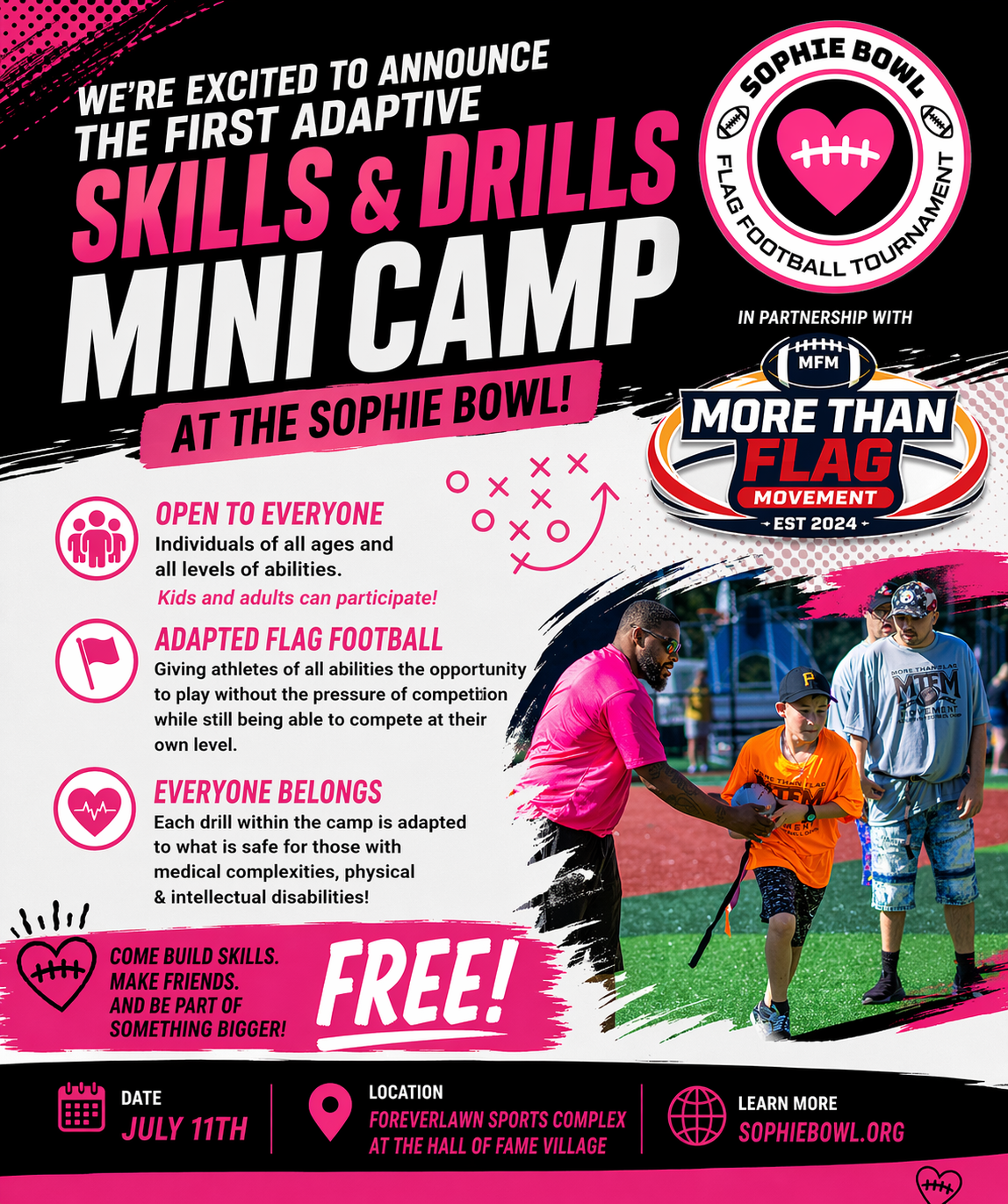 Our Adaptive Flag Football Camp is where barriers disappear and every athlete gets their moment. Through our partnership with More Than Flag Movement, we’re creating a space where kids and adults of all abilities can safely experience the joy, teamwork, and excitement of football—because the game is for all of us.